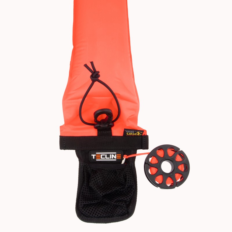 Boja Tecline 15/180 cm zawór nadm. i kaczy dzób, pomarańczowa, zintegrowana ze szpulką z tworzywa i linką 30 m.