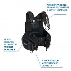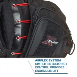Nowy X-Black posiada wyjątkowy system AirFlex, widoczny dzięki czerwonym linkom bungee. Proste wyważanie i gwarancja dużej stabilności. Jest to najlepiej wyposażony jacket w ofercie SCUBAPRO. Dzięki ergonomicznemu krojowi X-Black jest także najbardziej komfortowym jacketem, nawet wtedy, gdy jest w pełni napełniony powietrzem.
