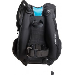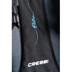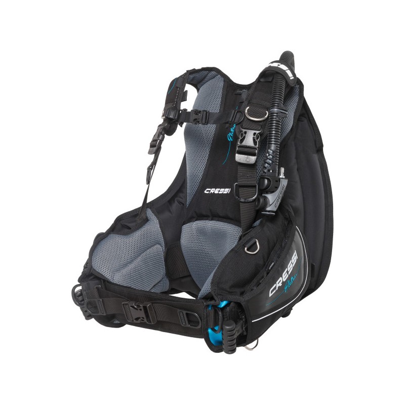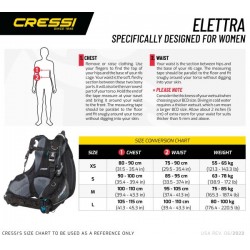 Elettra została zaprojektowana tak, aby dostosować się do kobiecej anatomii. Ekskluzywny design i właściwości techniczne zapewniają doskonałą pływalność przy ściśle dopasowanym profilu. Klamry 40 mm (w pasie) idealnie dopasowują się do kobiecej anatomii. Dolny pasek paska na ramię jest przymocowany do pierścienia, aby zapewnić obrót, a tym samym maksymalne dopasowanie do kobiecej anatomii. Część wewnętrzna jest w całości podszyta materiałem przepuszczającym powietrze, z grubszą wyściółką, która zwiększa komfort i poprawia odprowadzanie wody. Dwuczęściowy pas biodrowy wykorzystuje nowy opatentowany system spwb (samoobrotowy pas biodrowy). Miękka i wyściełana, półsztywna płyta tylna umożliwia złożenie bcd i transport przy minimalnej możliwej objętości. Zintegrowany system balastowy Cressi Flat Lock sprawia, że wyjmowanie worków balastowych jest szczególnie łatwe. Dwa zintegrowane wsporniki butli w kurtce poprawiają trym nurka