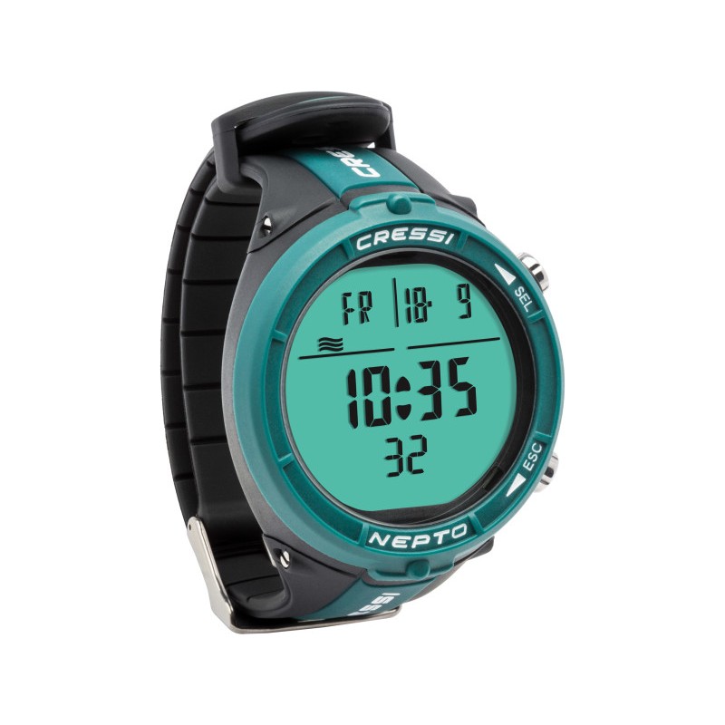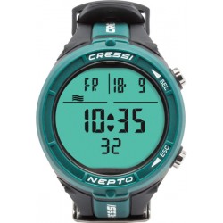 Dzięki średnicy koperty wynoszącej zaledwie 48 mm i wyświetlaczowi o wysokim kontraście wynoszącym 35 mm, nepto jest niezwykle kompaktowym zegarkiem przeznaczonym do freedivingu. Ten innowacyjny produkt posiada algorytm opracowany w cressi, który chroni freedivera przed ryzykiem taravany oraz funkcję zapobiegającą ryzyku obrzęku płuc. Szkło mineralne, wytrzymała obudowa ze stalowymi przyciskami zapewniającymi odporność na ciśnienie wody do 120 m, gumowy pasek ze sprzączką ze stali nierdzewnej