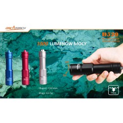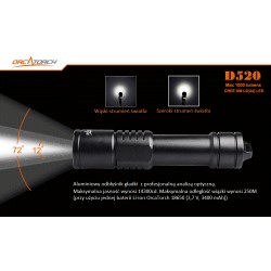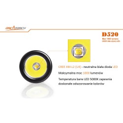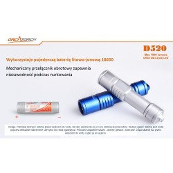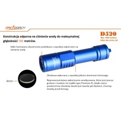 OrcaTorch D520 to lekka latarka nurkowa z mechanicznym przełącznikiem obrotowym, która zapewnia niezawodność pod wodą. Posiada amerykańską diodę LED XM-L2 (U4) w barwie białej o maksymalnej mocy 1000 lumenów, podczas gdy temperatura barwowa LED 5000K zapewnia doskonałe odwzorowanie kolorów. Zasilana przez jeden akumulator 18650, jej czas pracy może osiągnąć 2 godziny. Dodatkowo wytrzymała konstrukcja odporna na ciśnienie wody i łatwa obsługa. Latarka D520 sprawdzi się zarówno podczas nurkowania rekreacyjnego jak i technicznych.