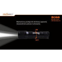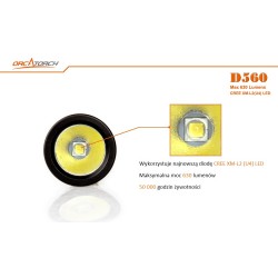 ORCATORCH D560 to mini latarka nurkowa o długości zaledwie 9 cm . Jej maksymalna moc może osiągnąć 630 lumenów dzięki pojedynczej baterii 14500, a najdłuższy czas pracy to 1 godzina 25min przy użyciu jednej baterii AA. Latarkę można obracać się o 360° przy zastosowaniu mocowania Orkatorch MX05.