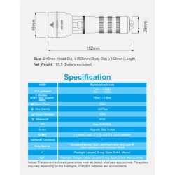 Latarka wyposażona jest w antyrefleksową, mineralną soczewkę z grubego nietłukącego szkła. Soczewka jest hartowana i przy zastosowaniu ultra jasnego szkła, spełnia dobre warunki przepustowości (98,5%), co umożliwia maksymalną intensywność świecenia na poziomie 45 970 kandeli.
