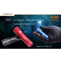 ORCATORCH D560 to mini latarka nurkowa o długości zaledwie 9 cm . Jej maksymalna moc może osiągnąć 630 lumenów dzięki pojedynczej baterii 14500, a najdłuższy czas pracy to 1 godzina 25min przy użyciu jednej baterii AA. Latarkę można obracać się o 360° przy zastosowaniu mocowania Orkatorch MX05.