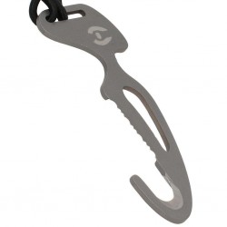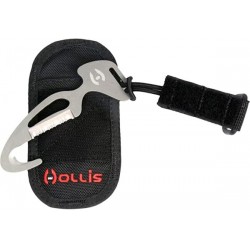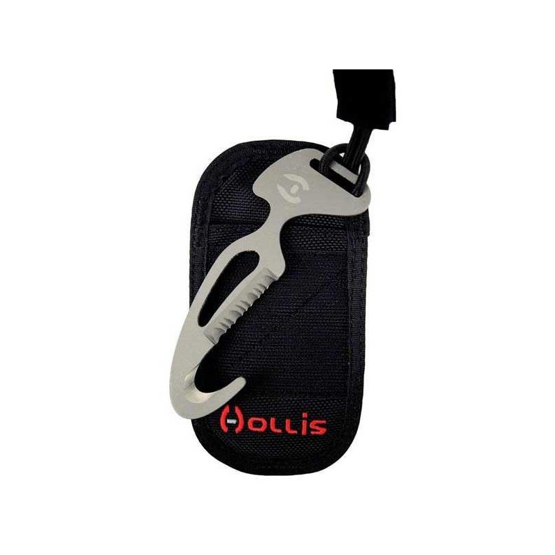 „Titanium Line Cutter” to lekki tytanowy nóż hakowy z ząbkowanym ostrzem firmy Hollis do przecinania żyłki lub linek. Posiada zapięcie na rzep oraz możliwość pionowego lub poziomego mocowanie do taśmy uprzęży. Jest niezbędnym narzędziem do cięcia dla każdego nurka.