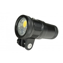 V14 – Latarka nurkowa foto/video z funkcją turbo światła video 4000lm. Wyposażona w 1 szt. diody emitującej światło 5000k, Ra 80 oraz 10 szt. diod emitujących światło czerwone, niebieskie, różowe oraz 1 szt. diody emitującą światło spot.