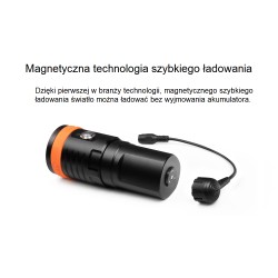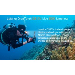 OrcaTorch D910V posiada układ CREE LED do równomiernego oświetlania obiektów z kątem świecenia 120 °. Ma trzy poziomy o maksymalnej mocy świecenia 5000 lumenów, które są sterowane przez jeden tytanowy włącznik boczny. Dzięki pierwszej w branży technologii szybkiego ładowania magnetycznego latarkę można ładować bez wyjmowania baterii.