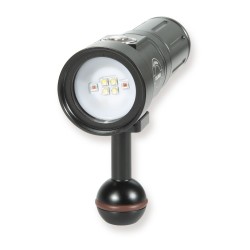 Bardzo mała, lekka, super jasna lampa z funkcją przyciemniana do fotografii i wideo z szerokim kątem świecenia 100° i mocą około 2000 lumenów, idealna dla wszystkich twórców filmów podwodnych. Czas pracy okło 60 minut przy 100% jasności. Przełącznik wielofunkcyjny do wyboru posiada możliwość przełączenia pomiędzy szerokokątnymi diodami LED oraz diodami LED o świetle czerwonym.