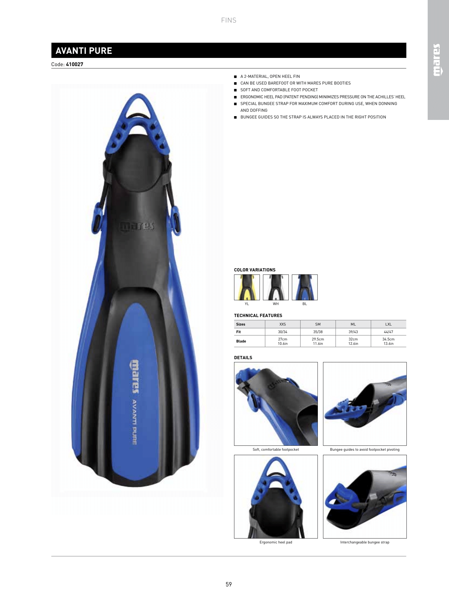 Płetwy nurkowe Avanti Pure mają długość pióra od 27 do 34,5 cm w zależności od rozmiaru. Płetwy mają otwartą kieszeń na stopę i są wykonane z dwóch materiałów. Dzięki miękkiej i wygodnej kieszeni na stopę można ich używać również na boso lub z wygodnymi miękkimi skarpetami. Posiadają prowadnice na gumki, które zapobiegają obracaniu się kieszeni na stopę.