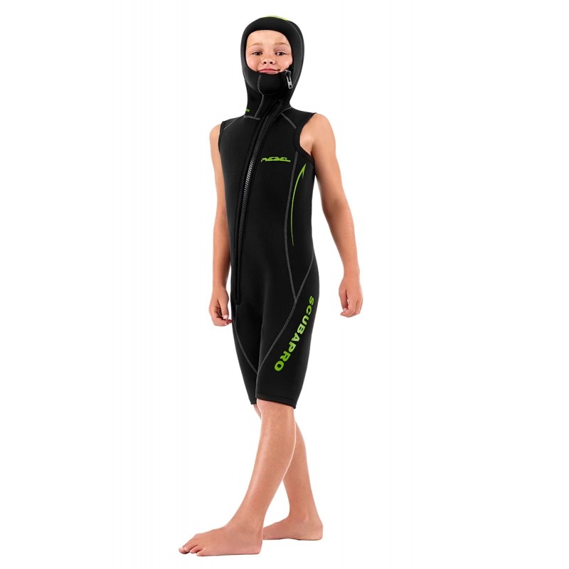 Jeśli chodzi o zwiększenie izolacji termicznej małego nurka, nie ma nic lepszego niż ta 5-milimetrowa kamizelka neoprenowa z doszytym kapturem i spodenkami w stylu rowerowym.