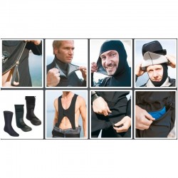 -Ciepłe, neoprenowe skarpety lub buty. Opcja skarpet ułatwia suszenie skafandra po jego wywinięciu na lewą stronę.