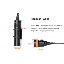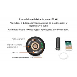 Latarka o maksymalnej mocy 4000 lumenów z regulacją kąta kabla wychodzącego z kanistra, umożliwiającą obrót 90°~180°. Akumulator o dużej pojemności zapewnia 5 godzin pracy w najmocniejszym trybie świecenia. Pakiet baterii można również wyjąć i wykorzystać jako Power Bank.